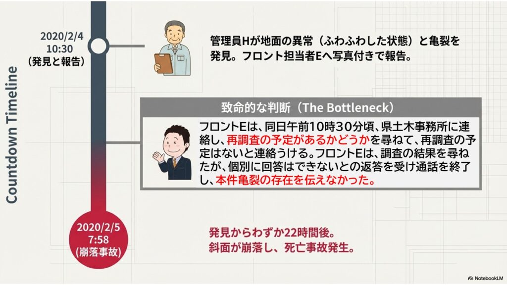 - 緊急時対応の不作為: 契約書には、緊急時には組合の承認なしで業務を実施できる規定(第8条)がありましたが、立ち入り禁止措置などの具体的なアクションを起こしませんでした。担当者は県土木事務所などに電話連絡はしたものの「個別に回答できない」と言われて、それ以上踏み込んだ対応ができませんでした。この時点では、まさか22時間後に崩落するとは考えていなかったのだと思われます。