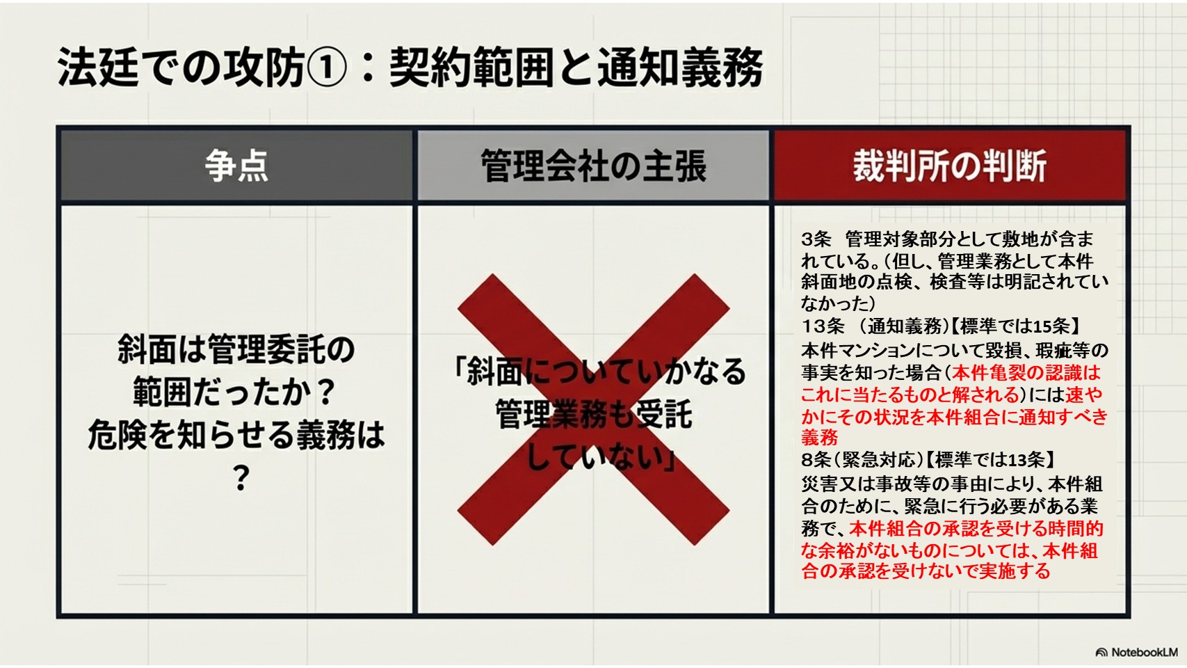 - 通知・報告義務違反: 管理委託契約書(第13条)には、マンションの毀損や瑕疵を知った場合には速やかに管理組合に通知する義務がありましたが、フロント担当者は亀裂の発見を組合へ伝えていませんでした。