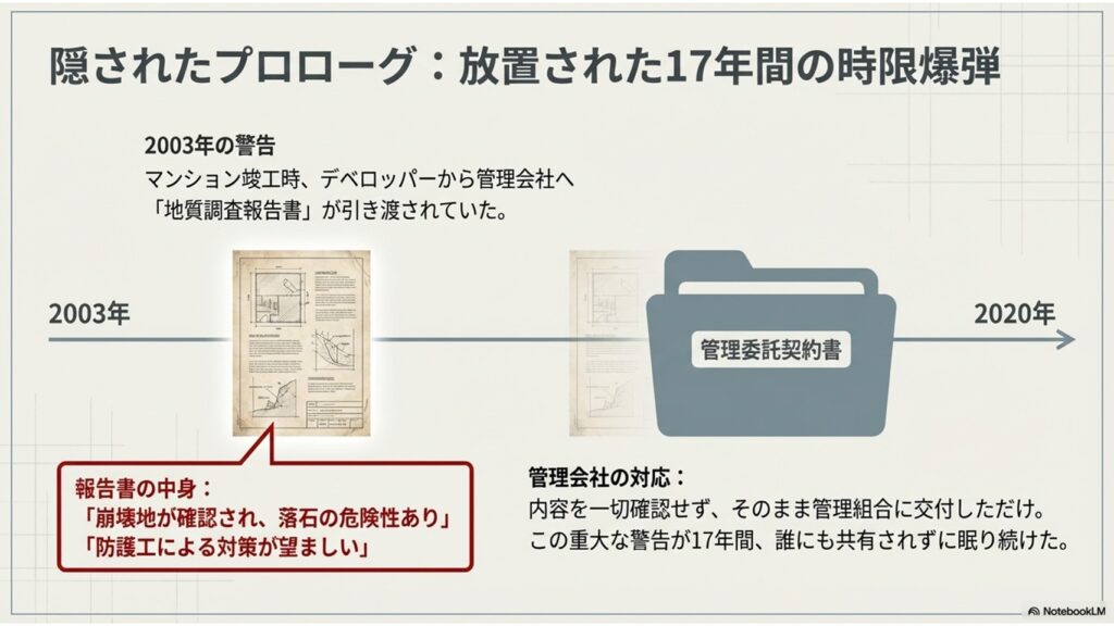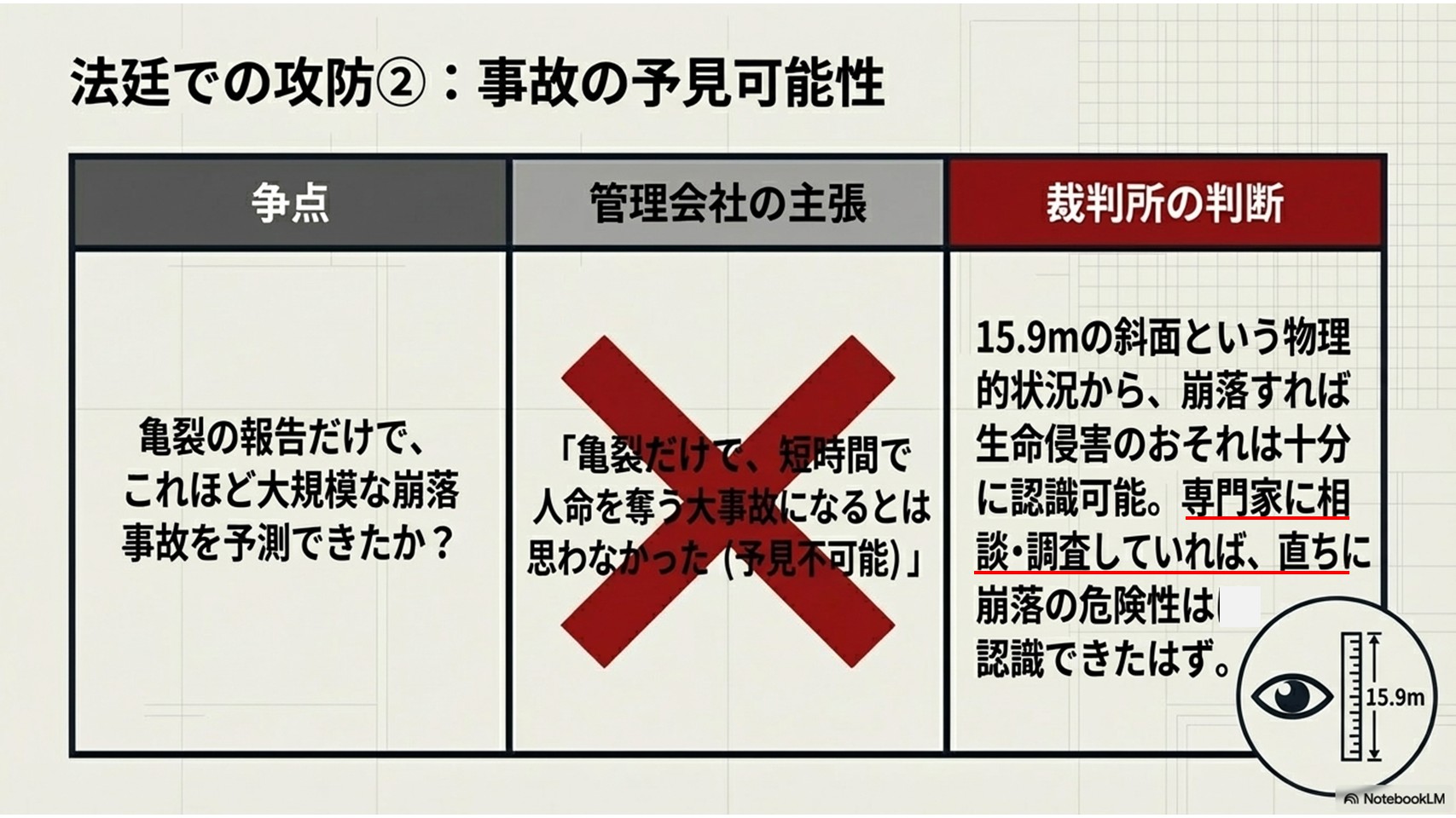 - 警告の放置: 2003年のマンション竣工時、デベロッパーから「本件斜面地は落石の危険性があり、防護対策が望ましい」とする地質調査報告書が交付されていました。しかし管理会社は長年これを確認せず組合に漫然と交付しただけであり、裁判所は「報告書を確認し、危険を察知した際には速やかに回避措置をとるよう従業員を指導すべき義務があった」と指摘しました。