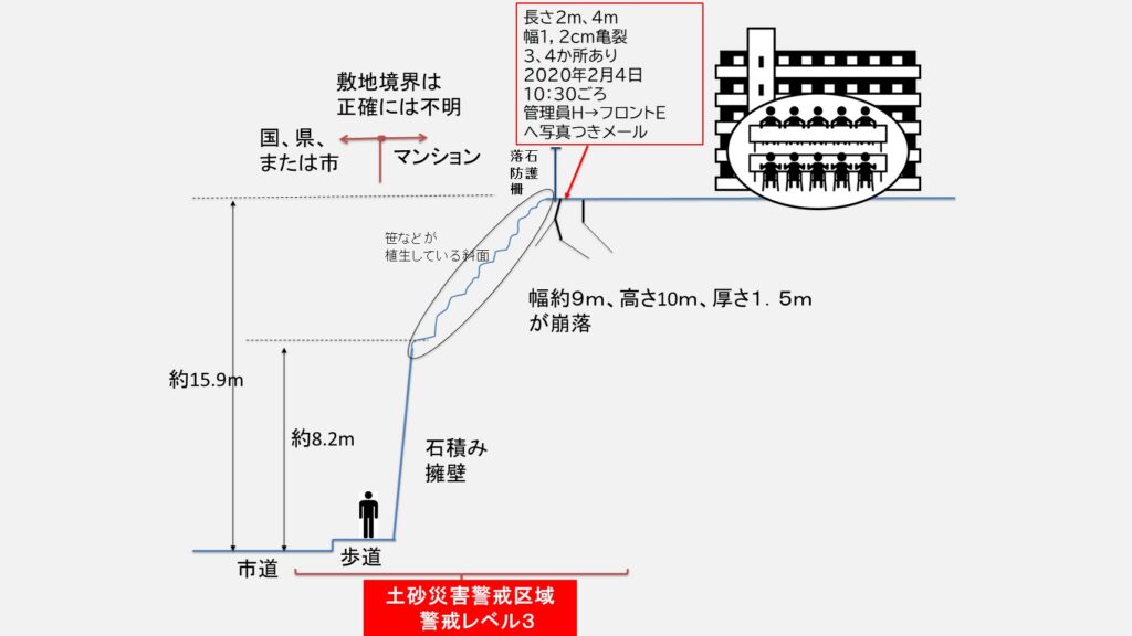 | 2020年2月4日 10:30ごろ | 管理員Hが敷地内に亀裂を発見してフロントEに報告 |